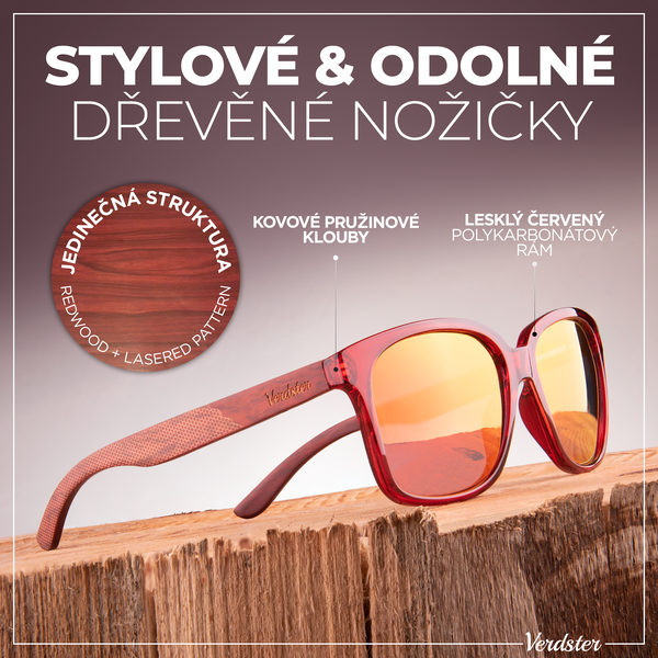Tyto brýle mají skla s revo technologií. Revo technologii původně vyvinula NASA pro použití na sklech skafandrů v kosmu. REVO kromě toho, že dobře vypadá (skla se lesknou a pod změnou úhlu mění barevné zabarvení), zabraňuje oslnění. Ideální doplněk na procházku v přírodě, ale i na pláž nebo na párty a setkání. Vhodné do auta na řízení, i na sportování všeho druhu. Brýle odolají dovolené u moře, ale i potu - dají se použít bez obav na sport. Dřevěný design dává brýlím vzhled, který je v posledních letech velice vyhledávaným doplňkem, jelikož se hodí opravdu ke každému typu oblečení. Tyto brýle jsou polarizované.